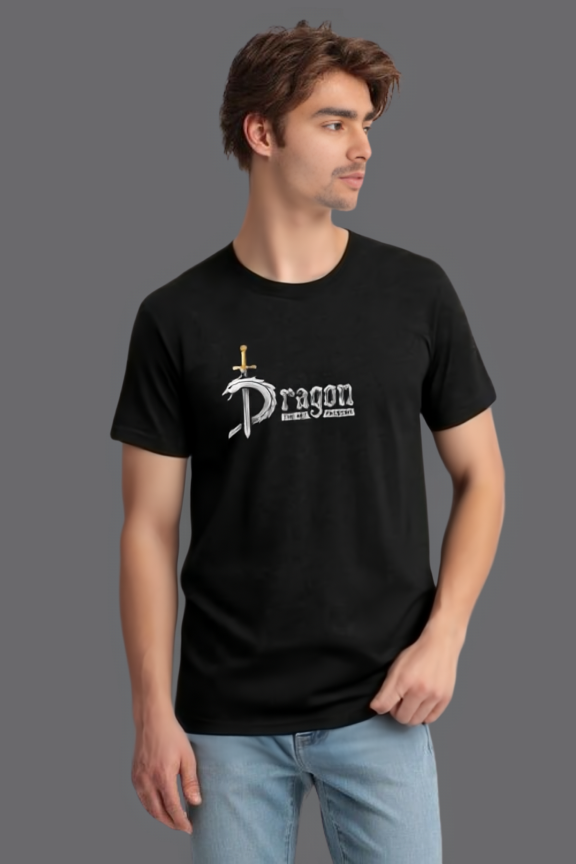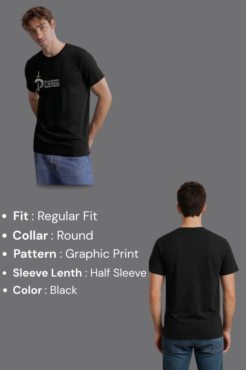 Unleash your bold style with this Dragon Slayer Black Graphic T-Shirt, designed for those who carry a fearless attitude. Made from 100% premium cotton, this half-sleeve t-shirt ensures breathable comfort and everyday durability. The striking Dragon typography with sword graphic print makes it a perfect statement piece for casual outings, concerts, or streetwear styling.