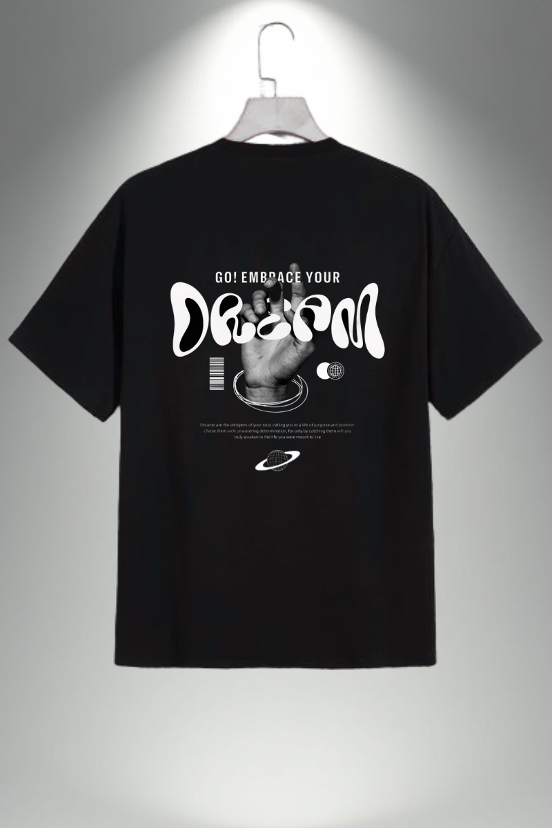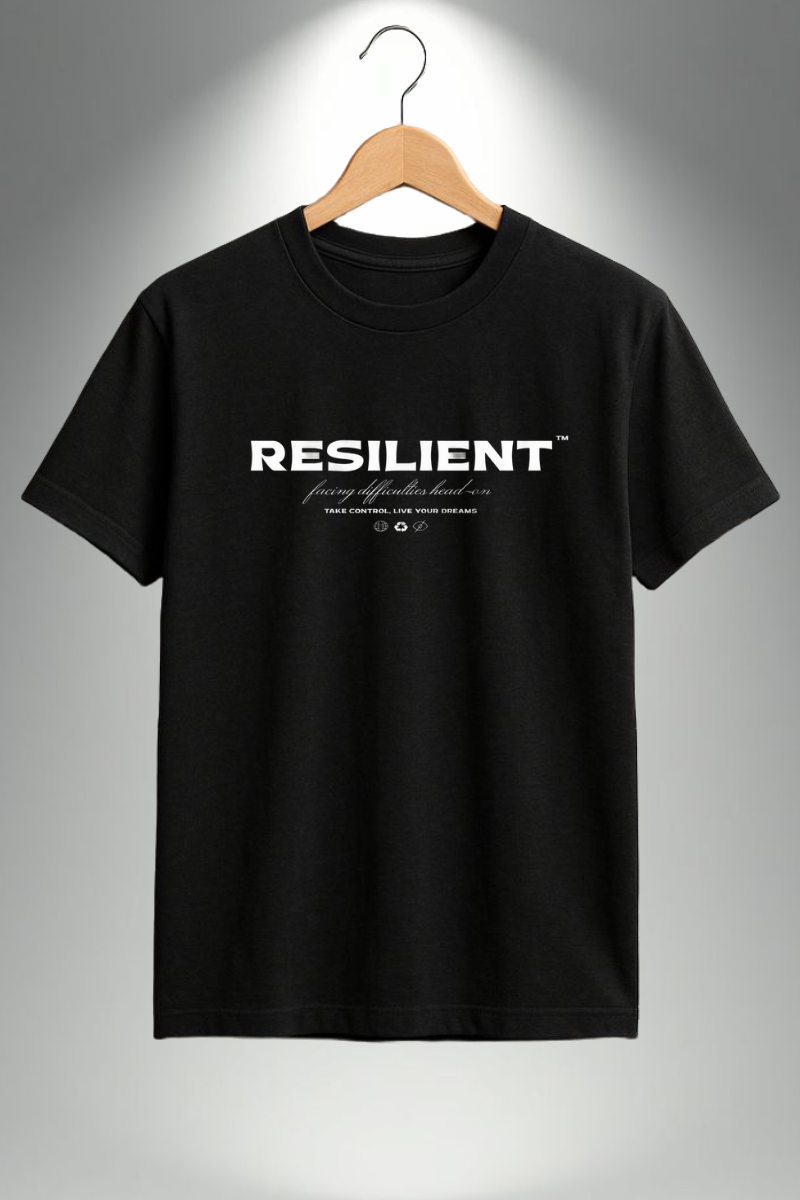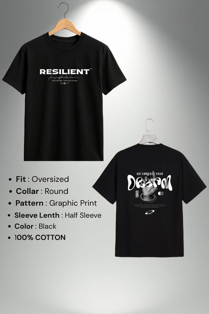 Made from 100% cotton, this oversized black T-shirt offers all-day comfort with a relaxed fit. Features a minimal “Resilient” print on the front and a bold graphic on the back, perfect for streetwear style.