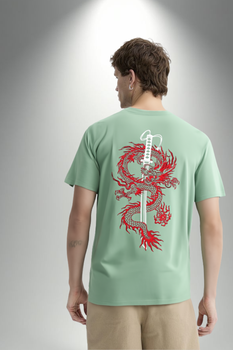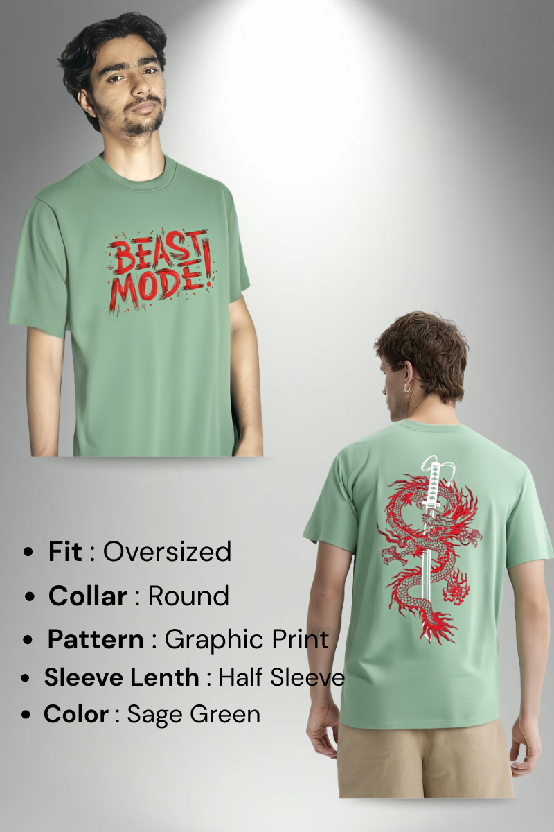 Elevate your streetwear game with this bold sage green oversized T-shirt for men, featuring a striking “BEAST MODE” front print and a powerful red dragon wrapped around a samurai sword on the back. Crafted from premium-quality fabric, this half sleeve tee comes with a comfortable round neck collar and a loose, relaxed fit—perfect for casual wear, gym style, or statement street fashion.